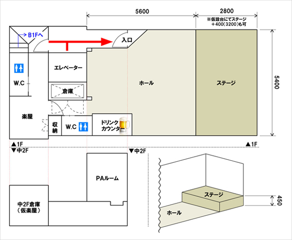 フロアーマップ![]() キャパシティ:スタンディング 100、着席 50 |